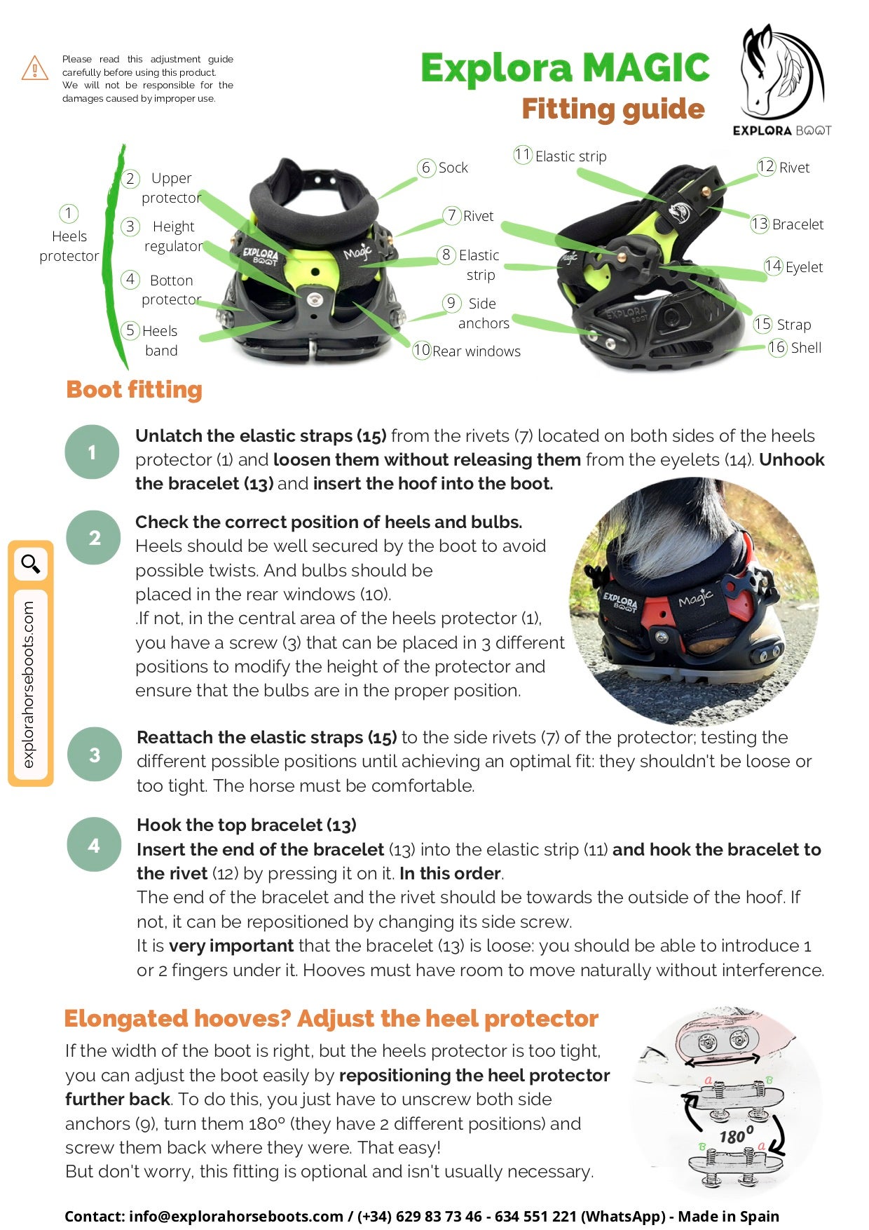 Explora Hoof Boots have multiple points of adjustment and can be manipulated with an Allen wrench, or a drill with an Allen wrench bit. The Explora Boot video below shows you how to make the boots larger or longer (6:22), how to adjust the height of the boot (9:28), how to adjust the lateral gaiter (11:38), how to correctly adjust the bracelet (13:12), and how to fit the neoprene sock with the boot (13:43).